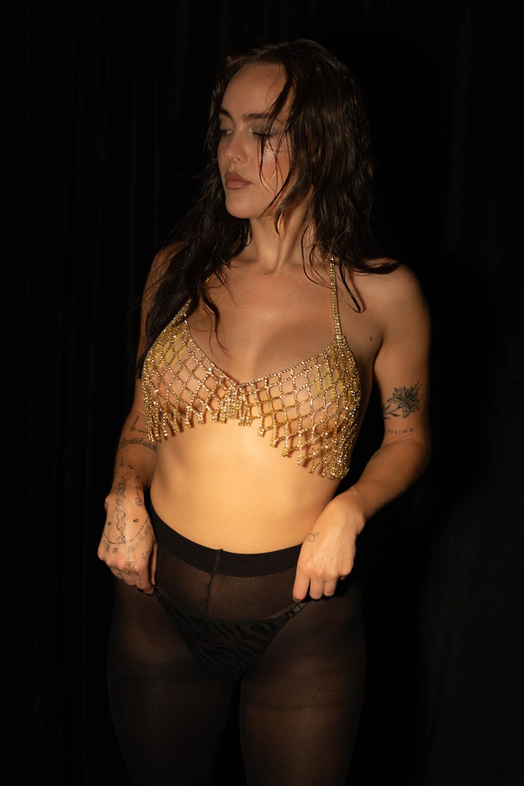 This eye-catching gold chain bralette top drapes beautifully over your bust, adding a touch of glamour to any look.