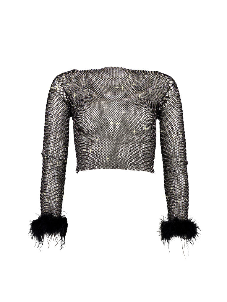 Wear the ultra-sexy Selena Diamante Long Sleeve Top with Fur with pasties underneath and the matching Selena Diamante Mini Skirt with Fur Trim, for maximum impact. Or layer over a cute bralette, and high-waist bottoms for your new favourite night out or festival look, ever.